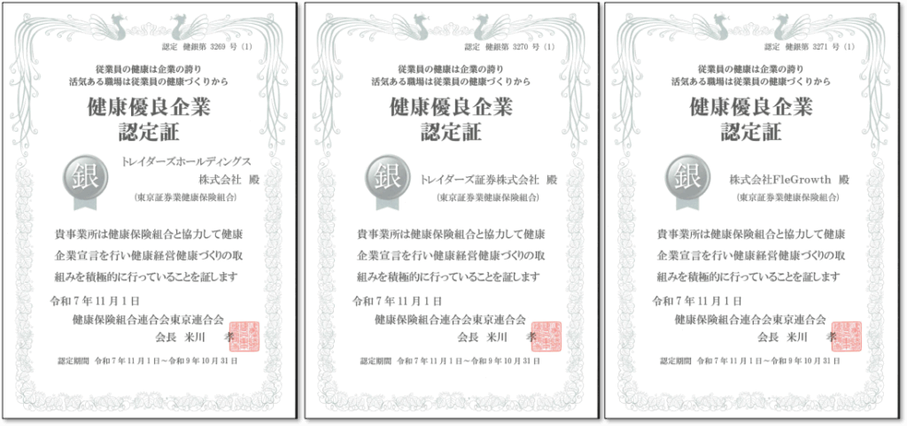 トレイダーズホールディングス株式会社(本社:東京都渋谷区、代表取締役会長兼社長:金丸 貴行)、トレイダーズ証券株式会社(本社:東京都渋谷区、代表取締役社長:須山 剛)、株式会社FleGrowth(本社:東京都渋谷区、代表取締役社長:森島 玲浩)の当社グループ3社は、健康保険組合連合会東京連合会より健康経営・健康づくりの取り組みを積極的に行っている企業として認められ、2025年11月1日付で健康優良企業「銀の認定」の更新が承認されました。